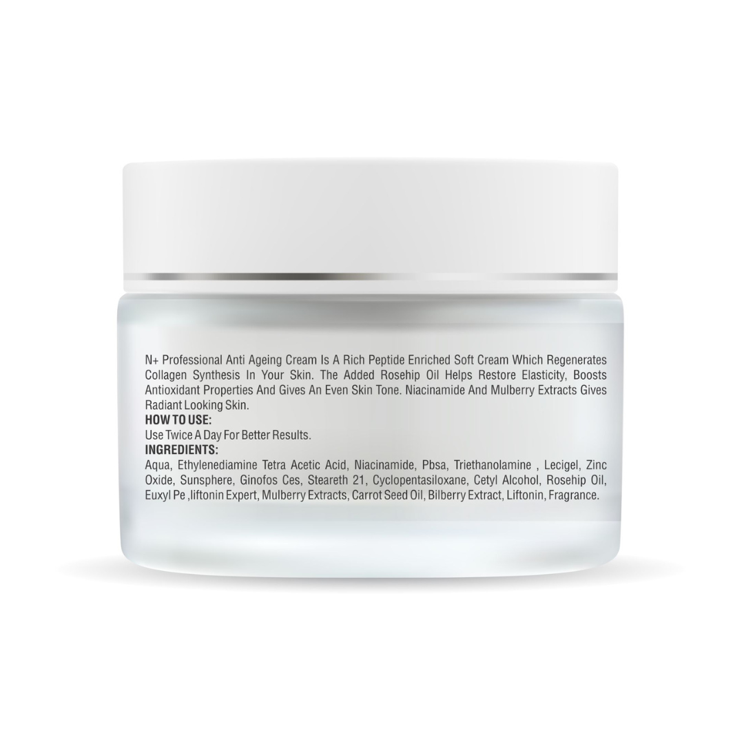 N+ Professional anti-aging Cream is a rich peptide-enriched soft cream which regenerates collagen synthesis in your skin. The added rosehip oil helps restore elasticity, boosts antioxidant properties, and gives an even skin tone. Niacinamide and Mulberry extracts give radiant looking skin.
